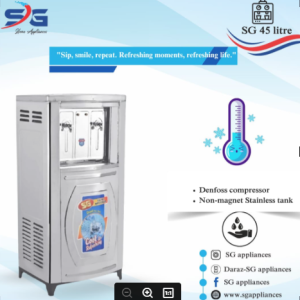 SG electric water cooler 65 litres,Pure copper pipes,Non-magnet steel tank, A Grade denfast compressor, Iron condensor, 3 water tapes, Double bearing 2 ways moving cooling with copper motor, Iso 9001 certified, Safe and secure,